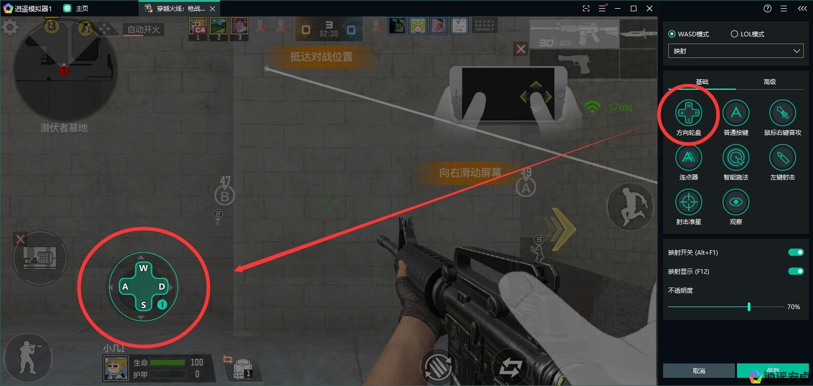 把方向輪盤拖拽到游戲界面的人物移動(dòng)輪盤處,按W/A/S/D控制人物前后左右移動(dòng)。(也可以自己更改鍵位設(shè)置)