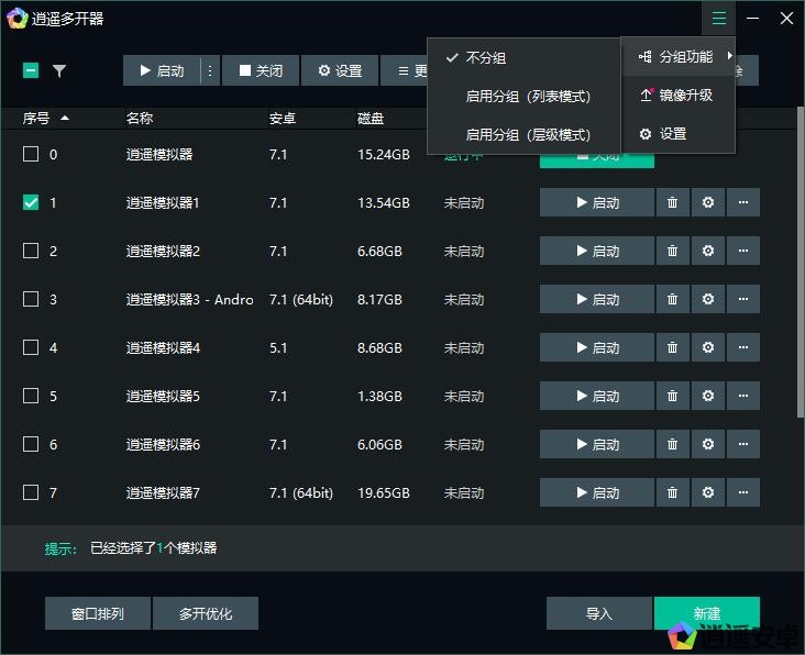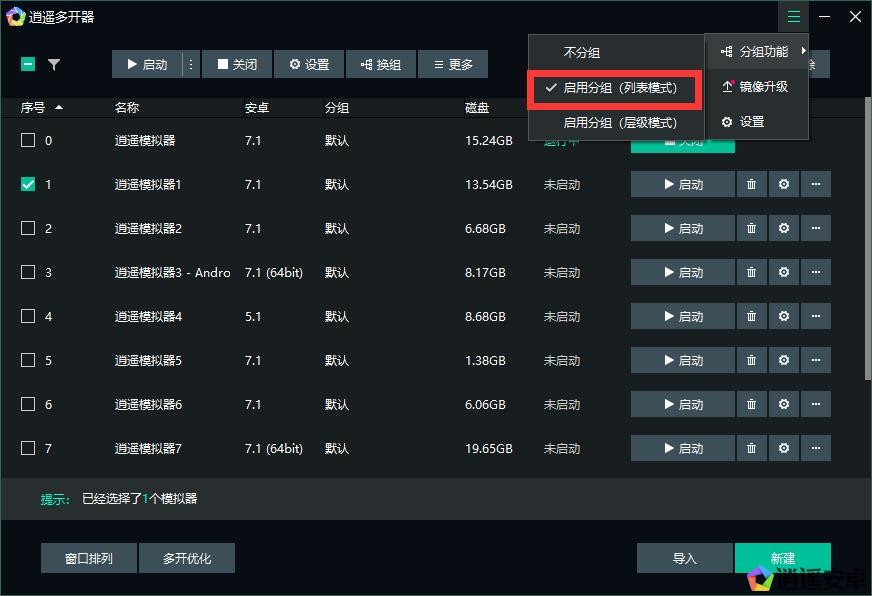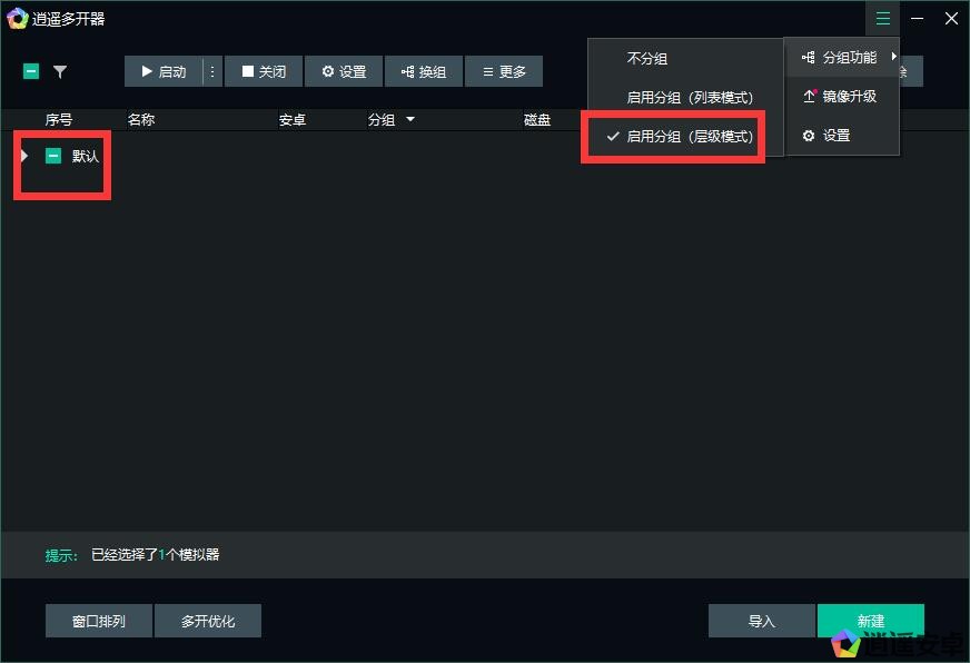 模擬器分組功能 最近修改日期:2024-2-21 本文主要介紹逍遙多開器中的模擬器分組功能操作 模擬器分組功能打開多開器軟件, 點擊右上角菜單鍵,選擇分組功能,即可對模擬器進行分組: 一、列表模式列表分組:可以從分組菜單中新建組或選擇已有的組別 二、層級分組層級分組:可以直接展開分組信息,并支持更改組別的名稱。