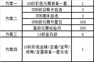 累計(jì)折后充值50000元(實(shí)付):UUR級(jí)元尊自選禮包5*10、13級(jí)寶石袋*6、8階虛空護(hù)石*1、8階虛空護(hù)肩*1、8階虛空護(hù)符*1、8階虛空文章*1
