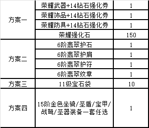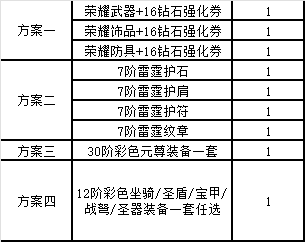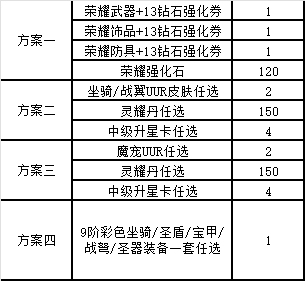 累計(jì)折后充值10000元(實(shí)付):UUR級(jí)元尊自選禮包5*4、11級(jí)寶石袋*4、榮耀防具+14鉆石強(qiáng)化券*1、榮耀飾品+14鉆石強(qiáng)化券*1、榮耀武器+14鉆石強(qiáng)化券*1