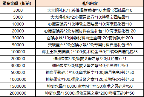 活動內容:活動時間內,玩家累計充值達到指定金額(折扣前),即可申請對應禮包