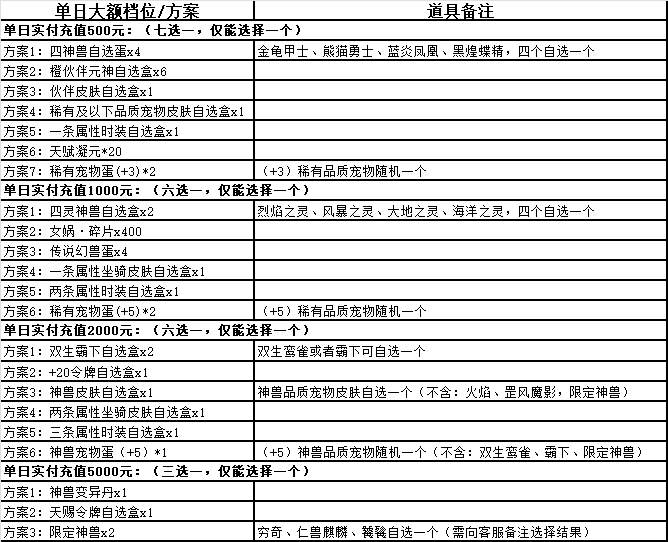 單日累計充值200000(實付1000)元:四神獸自選蛋*3、8級寶石禮袋*15、超級技能書自選盒*10、星辰藏寶圖*15;