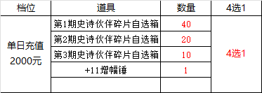 單日累充20000元:第2期史詩伙伴碎片自選*10、凝光玉*10、精粹魔力結晶*100、金幣*100w