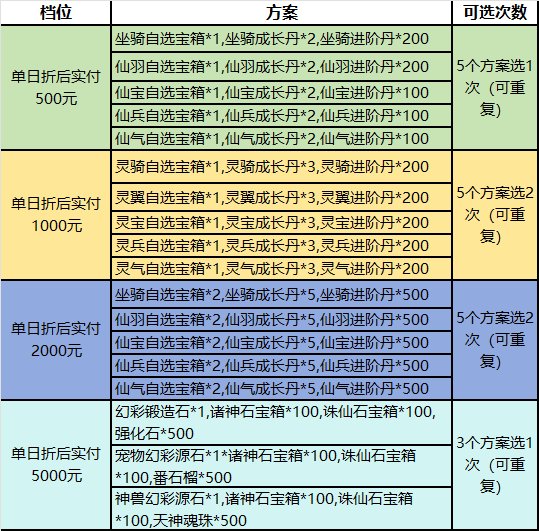 活動規則:活動期間,以充值最高金額為準,高檔位可以領取低檔位,每個號每個檔位只能領取一次