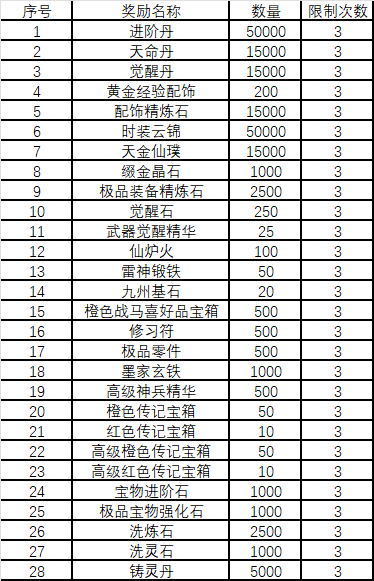 活動內容:活動期間,單日真實充值每滿500元(實付),可以從以下豪禮中任選1種方案作為額外豪禮,獎勵方案如下:(同種方案每日最多可同時兌換3次,特殊方案請咨詢客服)