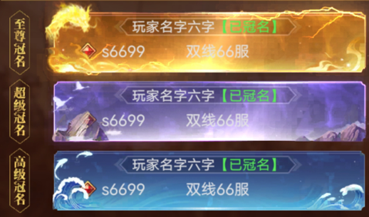 【活動規則】炫彩冠名活動一共分為三個檔位,更高檔位的冠名可覆蓋低檔位區服名稱與冠名炫彩特效。達到條件的玩家只可申請最高檔位的冠名特效與冠名獎勵,不可高檔位領取低檔位的獎勵