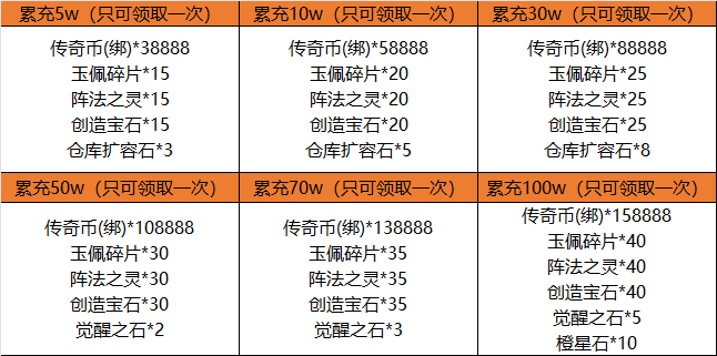 ①【限定稱號】單日充值滿5萬元即可獲時效為一年且裝備爆率+5的指定稱號:赤焰少帥、縱橫天下、戰地之王、一騎當千、踏雪無痕、肝膽相照、雄霸天下、千秋萬代、與君相依、與卿不離(十選一)