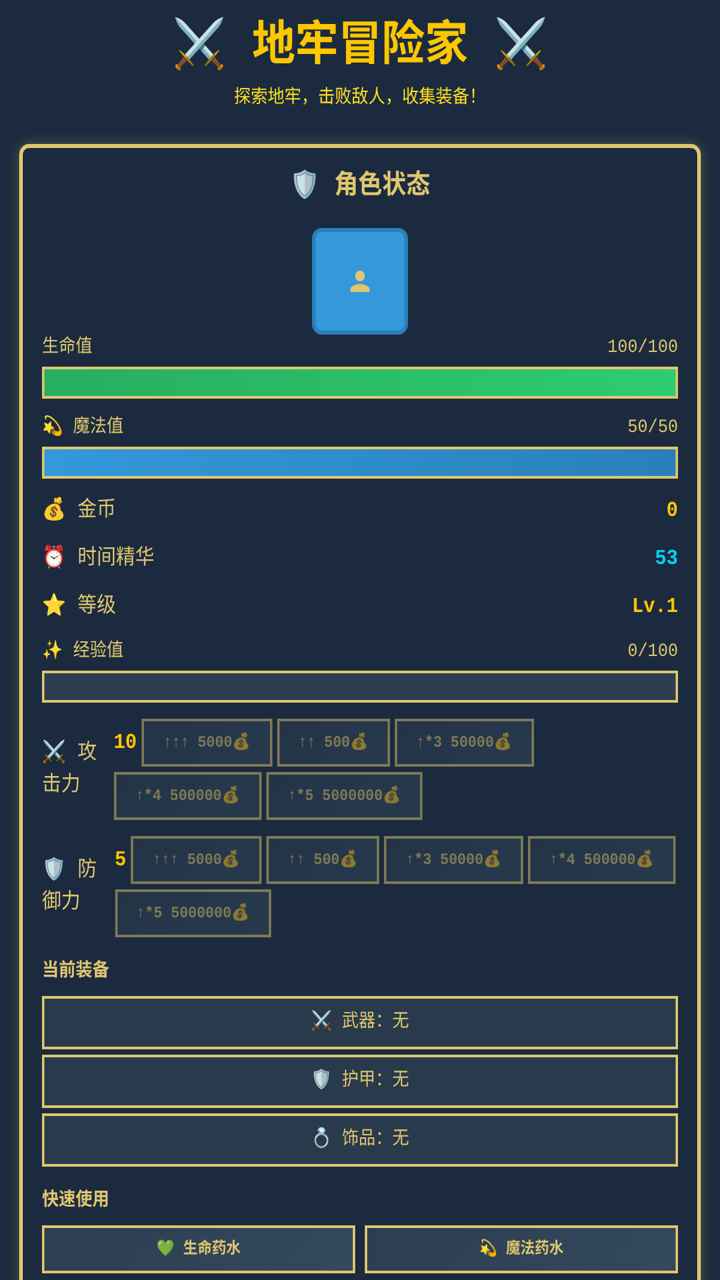 簡介地牢冒險家是一款充滿冒險和策略的像素風(fēng)格地牢探索游戲,玩家將扮演一名勇敢的冒險者,深入危險的地牢,與各種怪物戰(zhàn)斗,收集裝備,提升能力,終成為強(qiáng)的地牢征服者! 核心玩法: – 探索地牢:選擇不同難度的地牢,挑戰(zhàn)各種隨機(jī)生成的房間,面對未知的危險和寶藏。 – 戰(zhàn)斗系統(tǒng):與各種敵人展開回合制戰(zhàn)斗,運(yùn)用攻擊、防御和技能策略,戰(zhàn)勝強(qiáng)大的Boss。 – 裝備系統(tǒng):收集武器、護(hù)甲和飾品,提升角色屬性,還可以通過鐵匠鋪合并裝備,打造更強(qiáng)神器。 – 成長與升級:積累經(jīng)驗(yàn)提升等級,學(xué)習(xí)新技能,用金幣或特殊點(diǎn)數(shù)購買更高級的能力和道具。 – 任務(wù)與挑戰(zhàn):完成冒險者協(xié)會的任務(wù),獲取豐厚獎勵,解鎖成就和稀有物品。 特色亮點(diǎn): – 豐富的裝備和道具系統(tǒng),支持組合和升級。 – 多種難度選擇,適應(yīng)不同玩家的挑戰(zhàn)需求。 – 酒館NPC互動、魔法商行購買稀有道具,豐富的社交和交易系統(tǒng)。 – 成就系統(tǒng)記錄你的冒險歷程,展示你的勇者榮耀。 – 存檔和讀檔功能,隨時保存你的冒險進(jìn)度。 – 策略性:需要合理分配資源,選擇裝備和技能,才能在地牢中生存下去。 準(zhǔn)備好進(jìn)入充滿危險和機(jī)遇的地牢世界了嗎?拿起你的武器,開始你的冒險吧!