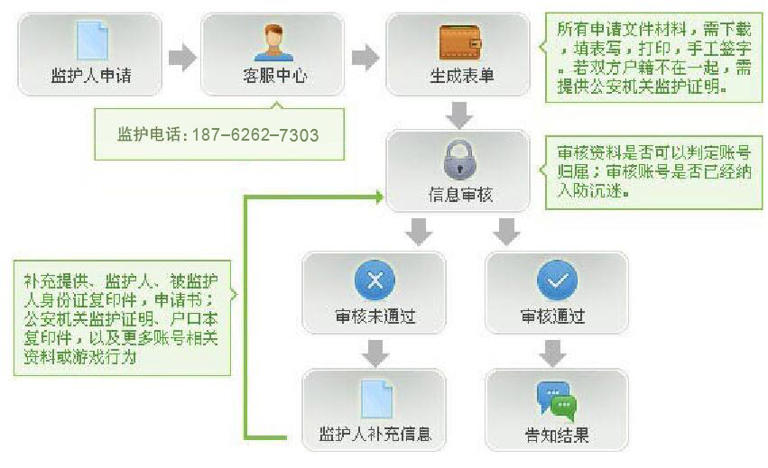 家長(zhǎng)監(jiān)護(hù)系統(tǒng)充分考慮家長(zhǎng)的實(shí)際需求,當(dāng)家長(zhǎng)發(fā)現(xiàn)自己的孩子玩游戲過于沉迷的時(shí)候,由家長(zhǎng)提供合法的監(jiān)護(hù)人資質(zhì)證明、游戲名稱賬號(hào)、以及家長(zhǎng)對(duì)于限 制強(qiáng)度的愿望等信息,可對(duì)處于孩子游戲沉迷狀態(tài)的賬號(hào)采取幾種限制措施,解決未成年人沉迷網(wǎng)游的不良現(xiàn)象,如限制孩子每天玩游戲的時(shí)間區(qū)間和長(zhǎng)度,也可以 限制只有周末才可以游戲,或者完全禁止。